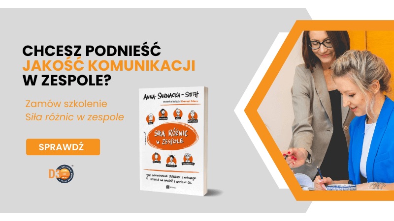 To jest reklama szkolenia mającego na celu poprawę jakości komunikacji w zespole. Tekst w obrazie brzmi: „CHCESZ PODNIEŚĆ JAKOŚĆ KOMUNIKACJI W ZESPOLE? Zamów szkolenie Siła różnic w zespole SPRAWDŹ”. Na obrazie widać również okładkę książki „Siła różnic w zespole” autorstwa Anny Sarnackiej-Smith. Na dole znajduje się przycisk „SPRAWDŹ”, który sugeruje możliwość uzyskania dodatkowych informacji na temat szkolenia.